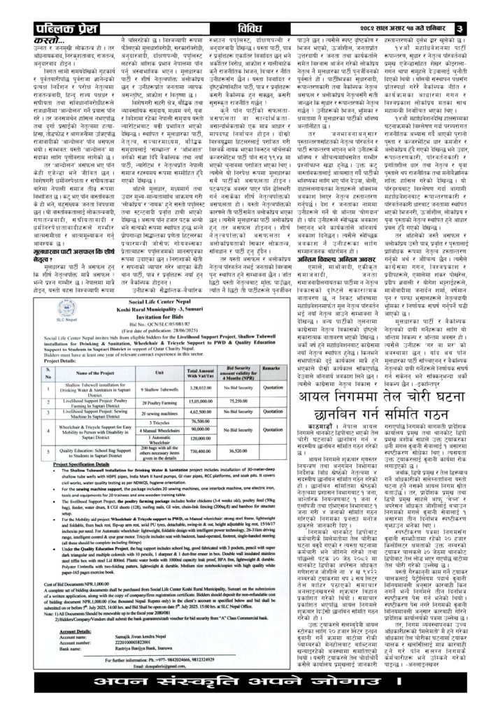 As an implementing partner of Qatar Charity since 2022 A.D, SLC Nepal provides services like Orphan & Disabled Sponsorship, Handpump Installation, Agriculture Irrigation/Boring Installation, Food Package Distribution, Adhahi/Qurbani Projects, Social House Construction for Poor Families, Tricycle & Wheelchair Distribution for Disabled People, and many more humanitarian projects. The organization is committed to empowering communities by improving access to quality education, health services, clean drinking water, and sustainable livelihoods. Our vision is to expand our services across every part of Nepal, reaching the most vulnerable communities in need.